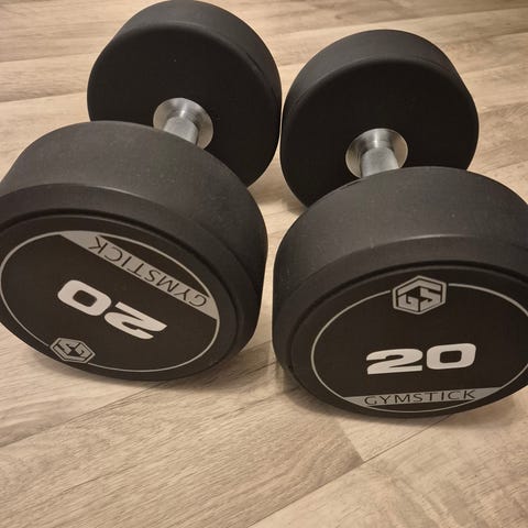 Hantlarna och stället är knappt använda och är som nya. Har ej blivit tappade i golvet,.