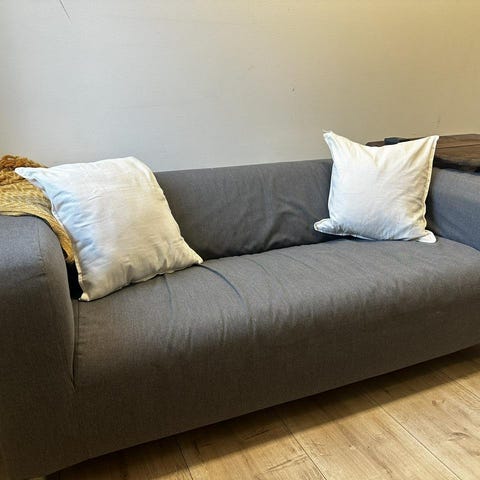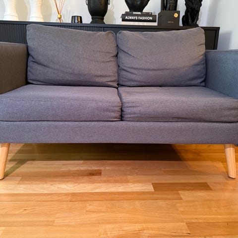En liten och bekväm soffa från märket Furninova. Den har några fläckar på sitsen och kuddarna, men de är avtagbara och går att tvätta. Vi har haft den ett tag och har varit supernöjda med den, den håller en mycket god kvalité. Vi gör oss endast av med den för att vi köpt en större soffa :)