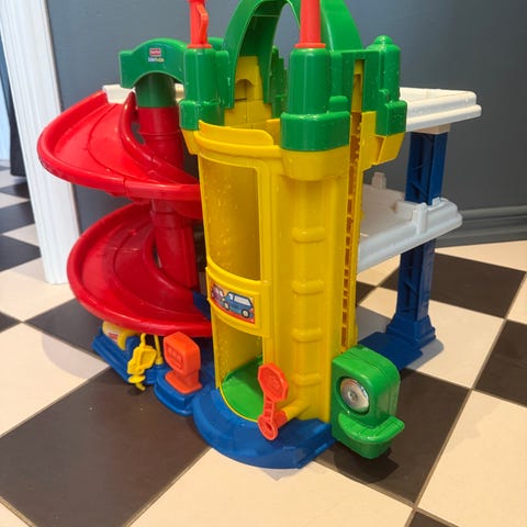 Fisher-Price bilbana leksak i plast med flera färger inklusive röd, gul och grön. Innehåller en spiralramp och olika spår för bilar att köra på. Passar för barn och är avsedd för lek och motorisk utveckling.