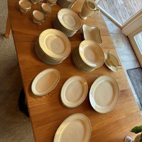 Eschenbach Bavaria Elfenbein Porzellan servisdelar i elfenbensfärgat porslin med guldkant. Setet inkluderar olika tallrikar, kaffekoppar, skålar och serveringsfat. Totalt drygt 60 delar, säljes allt tillsammans. Pris minst 400 kr eller budgivning. Finns i centrala Sigtuna, endast avhämtning.
