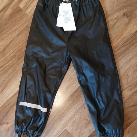 Helt nya regnbyxor med lappar kvar. Storlek 110. Vind- och vattentäta, svetsade sömmar, reflexdetaljer.