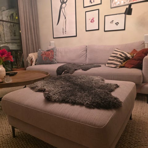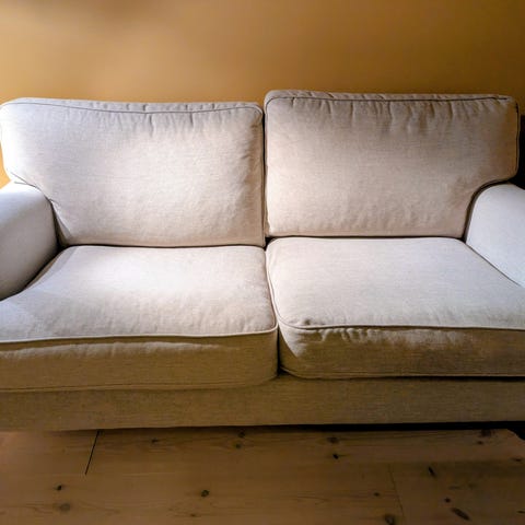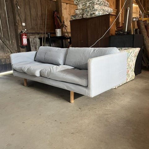Soffan är inköpt runt sent 90-tal/tidigt 2000-tal och är i använt men fullt fungerande skick. Tyget är original och visar viss patina/slitage, men inga större synliga skador.