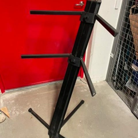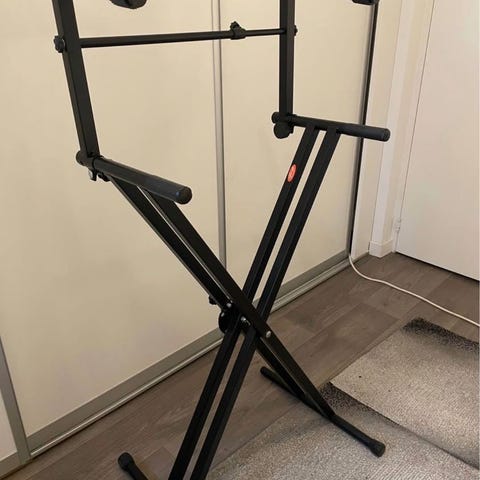 Keyboardställ i svart metall med X-formad design. Justerbart för olika höjder, lämpligt för att stödja keyboard eller synthesizer.