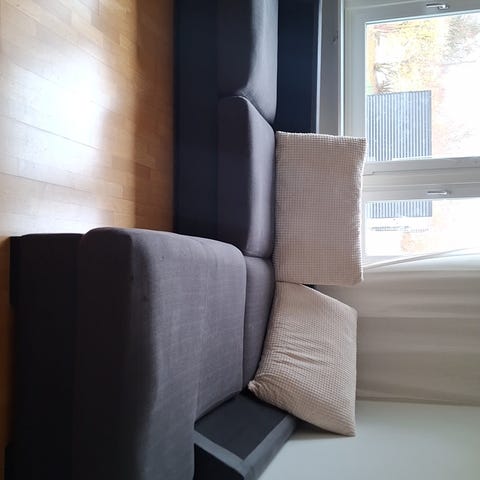 Röd tygsoffa i 3 delar, går att ta bort en sittplats om den blir för stor. Går att ta av klädseln på dynor och kuddar för tvätt. Har en liten fläck på toppryggen och klössmärken på sida. Inte lika intensivt röd live som bilden, lite solblekt.