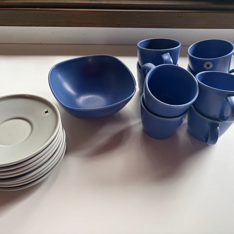 Högsnäs servis set i blyfritt stengods bestående av tallrikar, skålar och koppar.