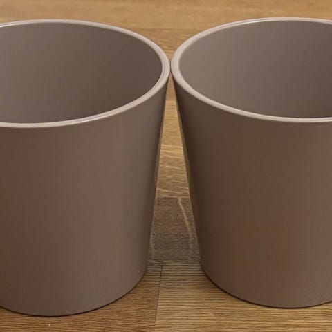 Två ytterkrukor i keramik, diameter 13 cm, höjd 11 cm. 20 kr för båda två. Ytterligare två st identiska med invändiga skönhetsfel följer med på köpet utan kostnad. Kan även hämtas i Skarpnäck-Västberga.