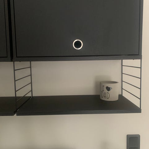 String hylla designad av Nils Strinning, 50-tal. Hyllan består av tre hyllplan i trä med mahogny faner och två sidostycken i svartmålad metall.