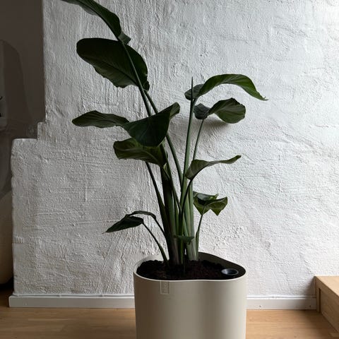 Strelitzia Nicolai är en stor grön växt med breda blad. Den levereras planterad i en vit fyrkantig kruka. Passar för inomhusbruk och bidrar med en tropisk känsla i rummet.
