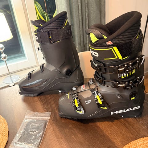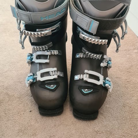 Head edge pjäxor i storlek 26.5 innermått med mörkgrå färg. Pjäxorna har flera spännen för justering. Insidan är klädd med mjukt material för komfort.