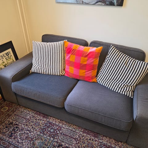 2-sits soffa med tygklädsel. Sittdyna och rygg i skum. Ben i massivt trä.