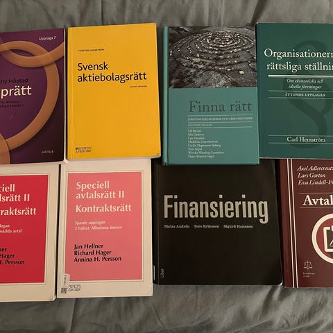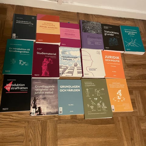 Notera att böckerna användes mellan år 2019-2024, därför kan flertalet av dessa upplagor vara äldre än den rekommenderade kurslitteraturen som ges ut av institutionerna idag (om du läser på juristprogrammet). Skillnaden är att det kan förekomma nyare praxis och lagändringar.