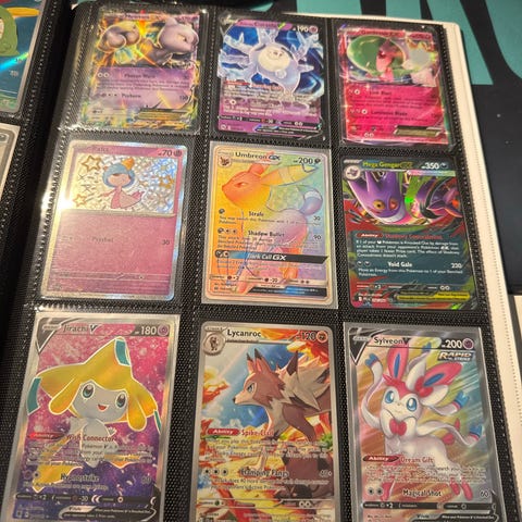Samlarkort från Pokémon i olika varianter och färger för samlare. Kort förvarade i plastfickor organiserade i pärm. Passar för samlare och entusiaster av Pokémon-kortspel.
