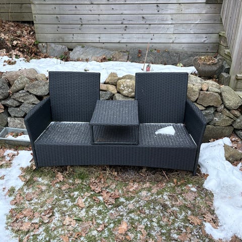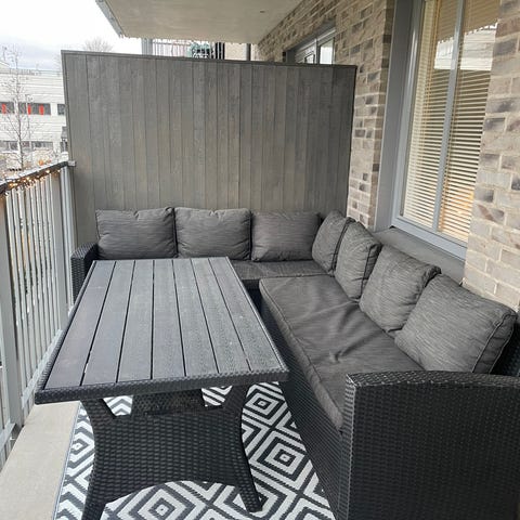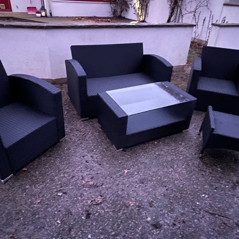 Utemöbelset bestående av hörnsoffa, fotölj och bord i rottingmaterial.