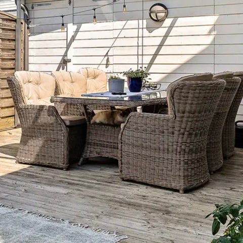 Utemöbelset i rotting med hörnsoffa och bord