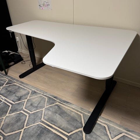 BEKANT Skrivbord sitt/stå, vit och träfärgad, 160x80 cm höj och sänkbart manuellt 65-125 cm