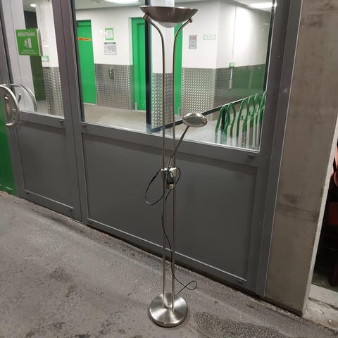 Golvlampa i borstat stål med justerbar arm och konisk lampskärm. Lampan har en stabil rund fot och en sladd med strömbrytare. Passar för allmän belysning i vardagsrum, sovrum eller arbetsrum.
