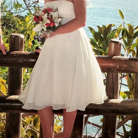 Bröllopsklänning i storlek S/M beroende på kroppsform. Klänningen har en synlig fläck, se bild.