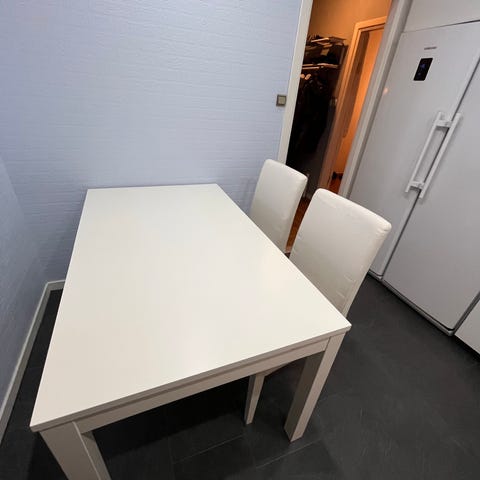 IKEA Ekedalen matbord med fyra stolar, Bordet och stolarna är i mörkbrun färg. Stolarna har klädda sitsar. En stol har lite problem. Man kan se en liten droppe blekmedel på den. Annars är den som ny.