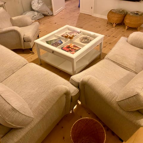 Tidlös soffgrupp i fint skick. Har stått i ett finrum och aldrig använts som huvudsoffa.