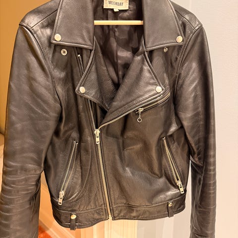 Svart bikerjacka från Stand Studio. Jackan har en klassisk biker-design med asymmetrisk dragkedja, bred krage och justerbart bälte i midjan. Silverfärgade detaljer som dragkedjor och tryckknappar.
