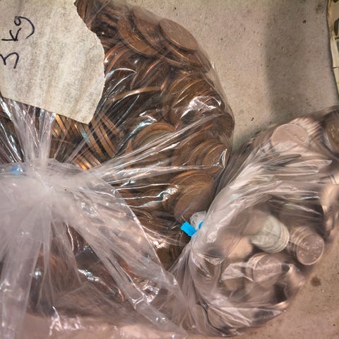 Samling av äldre mynt med varierande motiv och inskriptioner. Mynten visar olika kungliga emblem och årtal, inklusive ett mynt från 1776 med texten FÄDERNESLANDET. Mynten är av silver och har historiskt värde.