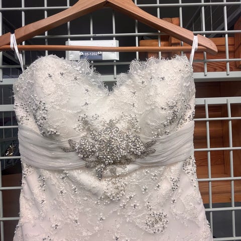 Brudklänning i storlek XS med vit färg och spetsdetaljer. Klänningen har en elegant design med ett flertal lager tyg för volym och struktur. Finns att testa utanför Malmö. Klänningen är köpt som del av ett större parti, finns ej några bilder där modell bär klänningen.