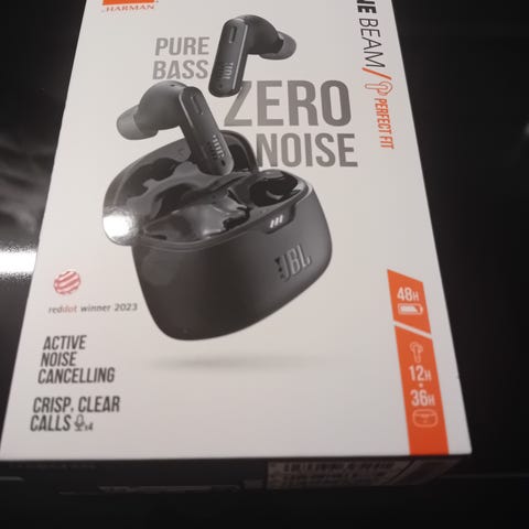 JBL Tune Buds trådlösa hörlurar i svart färg. Hörlurarna har funktioner som Pure Bass och Zero Noise för ljudkvalitet. Produkten inkluderar laddningsfodral och snabbstartsguide.