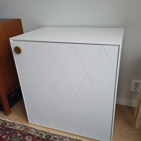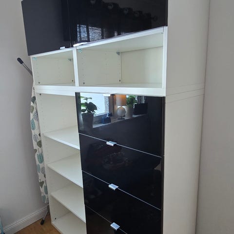 Ikea bestå skåp med väggfäste. Finns även möjlighet att sätta dit ben. Två dörrar med hyllor.
