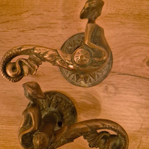Äldre dekorativ klämma i mässing/brons med klassiskt handmotiv.