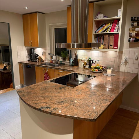 Köksinredning i trä (Asp) med bänkskivor i sten och laminat