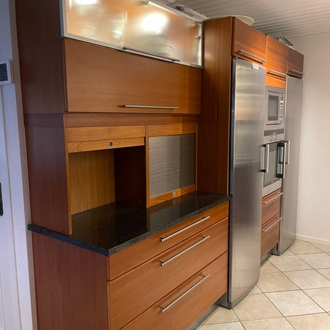 Köksinredning från Smedstorp i trä med bänkskivor i sten. Inkluderar vitvaror, i använt skick dock är frysen defekt så den åker på skroten. Köket har en köksö med svart italiensk stenbänkskiva och flera skåp och lådor för förvaring.