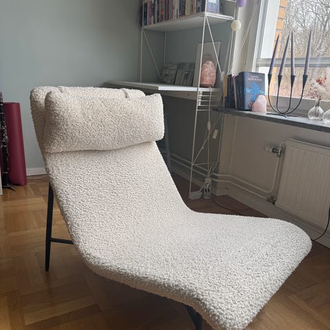 Fåtölj klädd i vitt boucle-tyg med svarta ben. Designad för inomhusbruk och passar för vardagsrum eller läshörna. Har en rundad rygg och armstöd som ger stöd och komfort.
