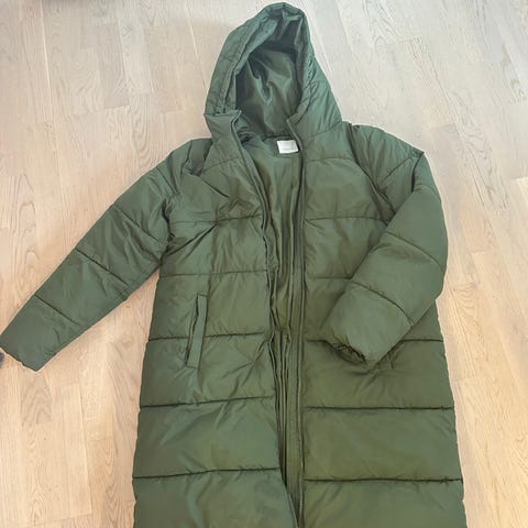 Olivgrön, lång vinterjacka i storlek M. Rak/normal passform. Endast använd en gång. Jackan har huva och dragkedja framtill samt två fickor med dragkedja.