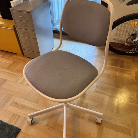 IKEA kontorsstol i grått tyg med armstöd och hjul. Har använts sällan och är därför i gott skick.