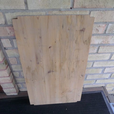 till vänster, gul furu bänkskiva/hyllplan 90x33 cm, 2 cm tjock. 95 kr.