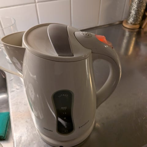 Säljer en mycket fin och stilren vattenkokare i en snygg ljusblå färg med detaljer i off-white. Den har en modern, minimalistisk estetik som passar perfekt i det skandinaviska köket eller på kontoret.