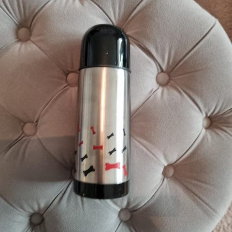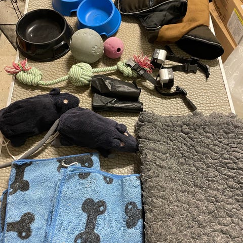 En samling av olika hundartiklar som inkluderar begagnade hundfiltar, hundmadrasser i olika storlekar och färger, enstaka gamla leksaker och begagnad matskål.