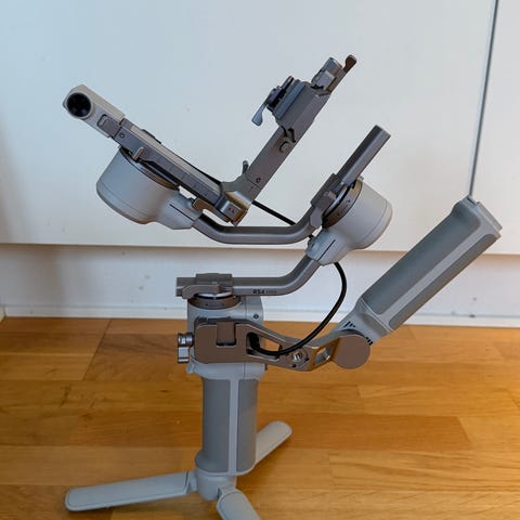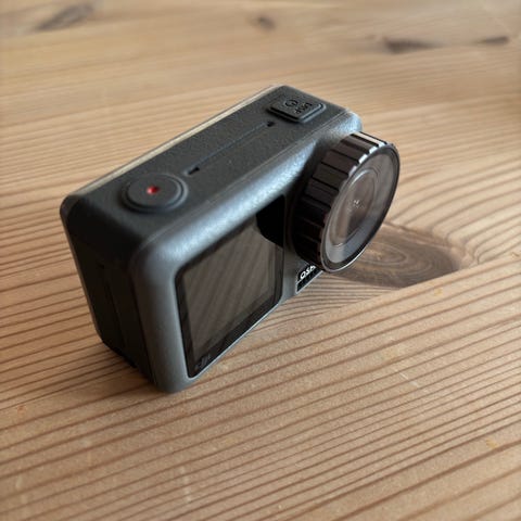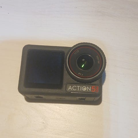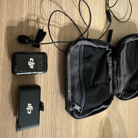 DJI Action 2 kamera med tillbehör som fästen och remmar. Kameran är kompakt och anpassad för actionfotografering.