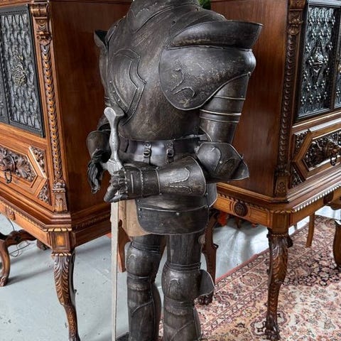 Ståtlig hel riddarrustning i naturlig storlek med tillhörande handsmitt svärd. En mycket dekorativ och gedigen uppsättning som direkt ger känsla av medeltid, riddare och historia.