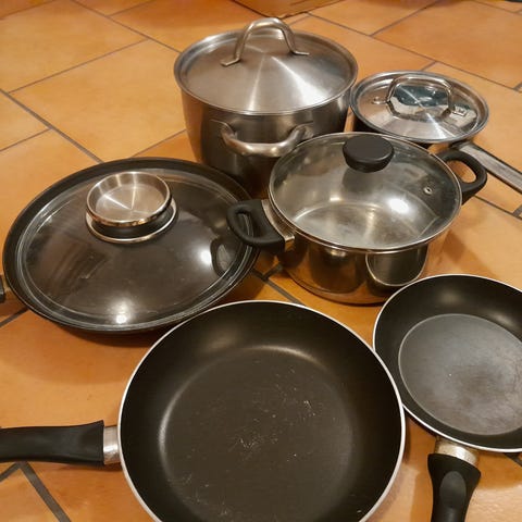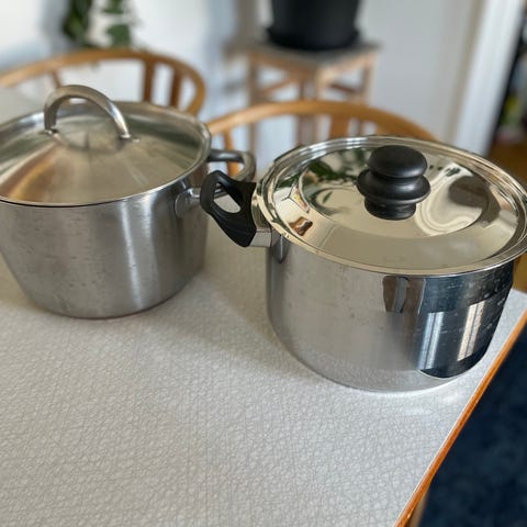 Kastrullset bestående av en gryta med lock, två små kastruller utan lock och en traktörpanna med lock. Välanvända men i bra skick. Jag har inte försökt putsa dem, jag gissar att det går att putsa upp dem till riktigt fint skick. Storlek, se bilder för mått.