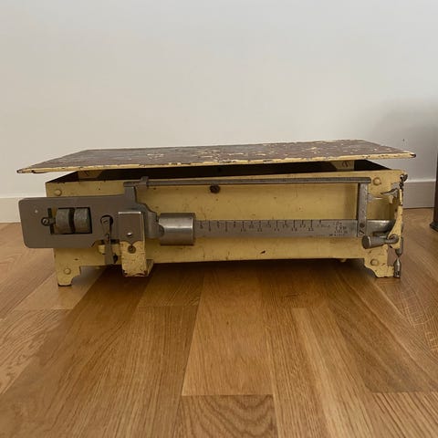Vågen är i använt skick med patina och rostfläckar som ger mycket karaktär (se bild). Skalan går upp till ca 10 kg. Osäker på om den är helt kalibrerad, så säljs främst som dekoration.
