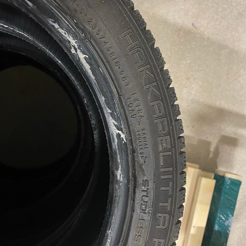 Däcken är använda och saknar en del dubbar, men funkar fortfarande bra som vinterdäck, perfekt som extrahjul eller för arbetsbil.