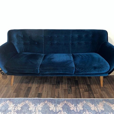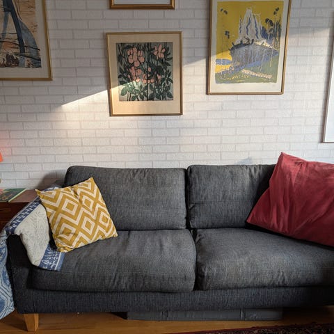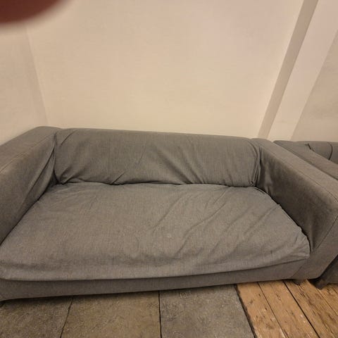Tyget börjar lossna på ena armstödet och det finns en del lösa trådar