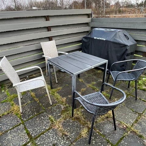 Svart rottingstol med metallben. Stolens design består av rottingmaterial och ben av metall, vilket ger en kombination av naturligt och industriellt utseende. Passar för inomhus- och utomhusbruk beroende på miljö. Köpta på Jysk.