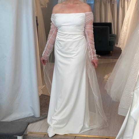 Super fin helt ny oanvänd bröllopsklänning endast testad långärmad off shoulder med släp och strass och pärlor.