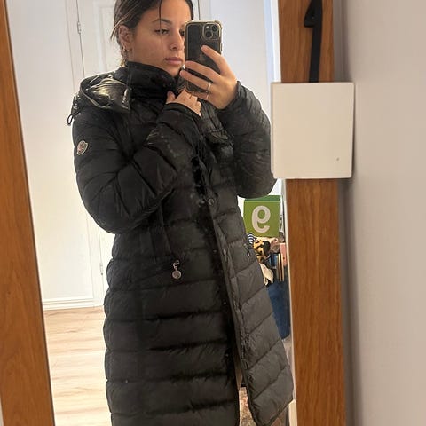 Super snygg moncler vinterjacka för dam i storlek S. Jackan är svart och tillverkad i dunmaterial, vilket ger isolering och värme under kalla förhållanden.