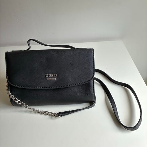 GUESS läderväska för kvinna i brunt läder med kedjedetaljer. Väskan är designad för att bäras som en mindre axel- eller handväska och passar för vardagligt bruk.