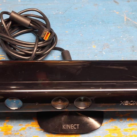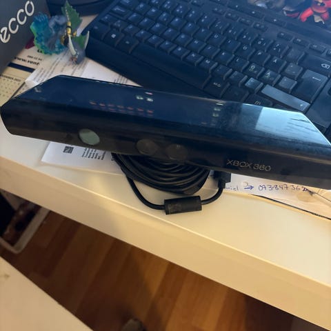 Microsoft Xbox 360 Kinect sensor för rörelsestyrning till Xbox 360-konsol. Enheten är svart och används för att möjliggöra spel och interaktion utan handkontroller genom rörelsedetektering.