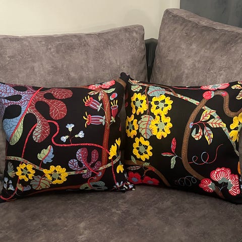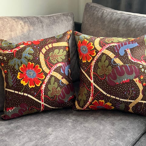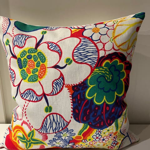 Tyget är ritad av Josef Frank från svenskt tenn. Baksidan är i enfärgad matchande tyg. Kuddfodralen är hemsydda med överlock och har en dragkedja i botten.