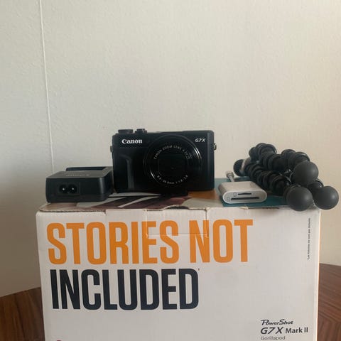 Canon G7X kamera i svart färg. Kompakt design med inbyggd zoomobjektiv, lämplig för fotografering i olika miljöer och även extremt bra på filma. Jag har bara nyttjat den ett år och aldrig filmat med den endast tagit bilder.